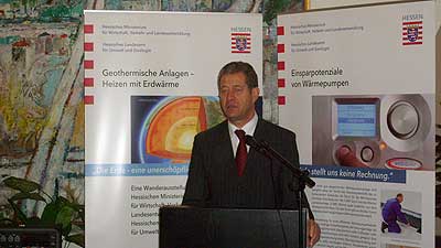 Im Beisein von Landrat Matthias Wilkes, Bürgermeister Thorsten Herrmann, Obermeister der Kreis Handwerkerschaft Heinz Krauß, Peter Stephan, Kandidat des Landtags der CDU, dem Abgeordneten des Hessischen Landtags Dr. Peter Lennert, informierten Prof. Katzenbach von der TU Darmstadt und Oliver Sturm den Minister zu den erreichten Werten der CO2-Sonden-Wärmepumpenanlage. Alle Anwesenden zeigten sich positiv überrascht von den hervorragenden Zahlen, die nicht selbstverständlich für Wärmepumpen sind, aber eine Vorstellung des Machbaren geben.